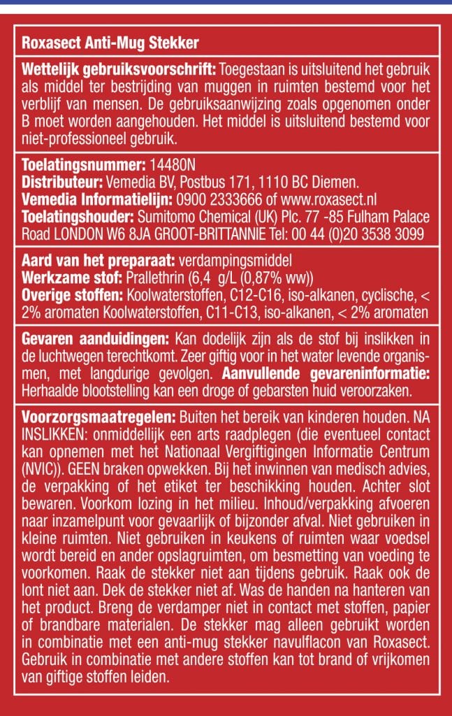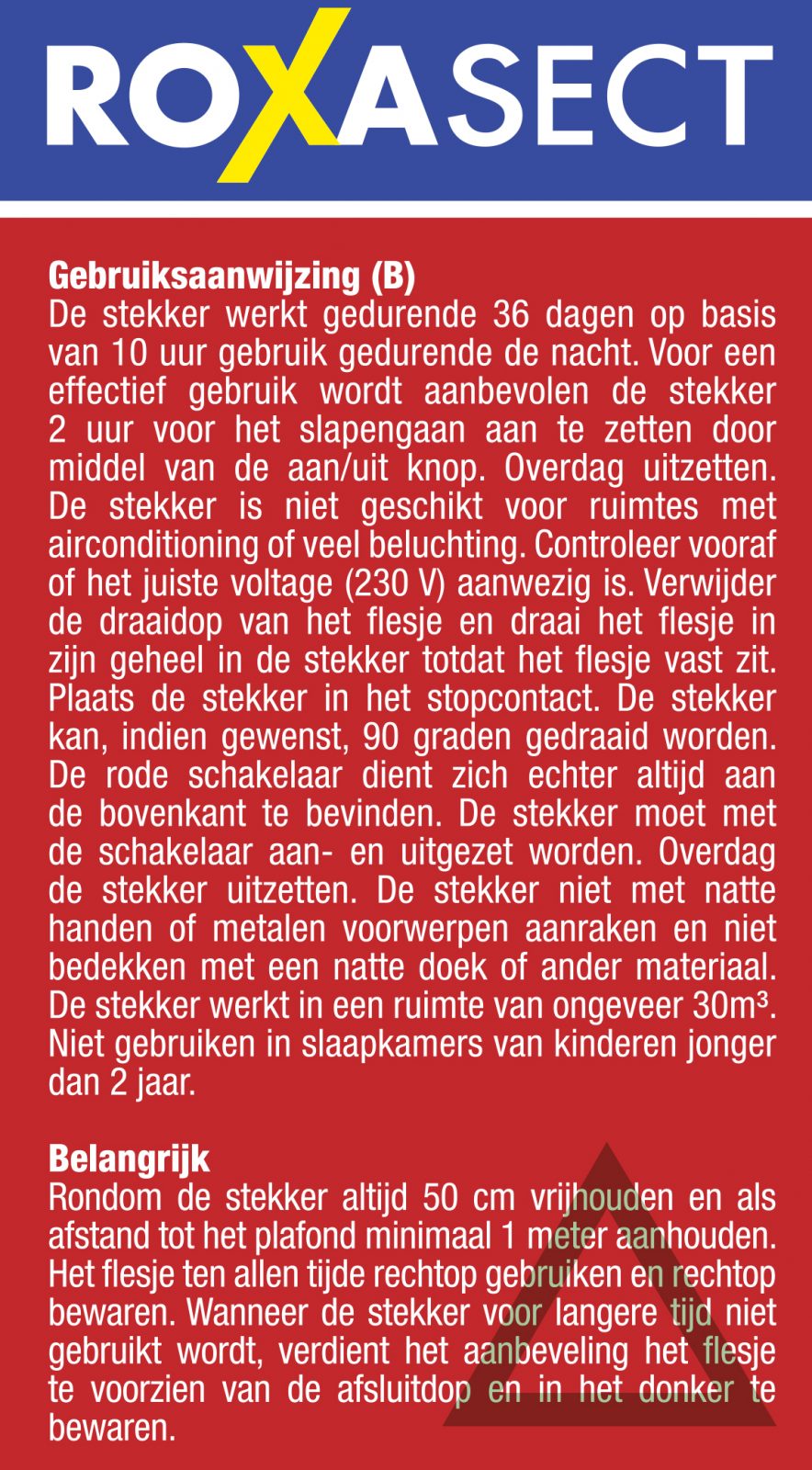 De stekker werkt gedurende 36 dagen op basis van 10 uur gebruik gedurende de nacht. Voor een effectief gebruik wordt aanbevolen de stekker 2 uur voor het slapengaan aan te zetten door middel van de aan/uit knop. Overdag uitzetten. De stekker is niet geschikt voor ruimtes met airconditioning of veel beluchting. Controleer vooraf of het juiste voltage (230 V) aanwezig is.