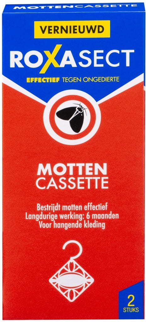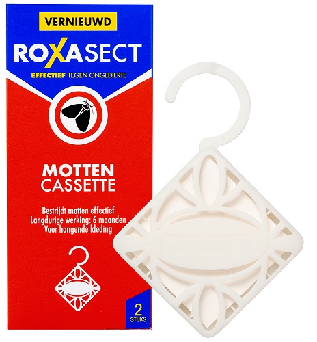 Haal de cassette uit de plastic verpakking. Plaats de datum indicator op de maand dat de cassette vervangen moet worden (na 3 maanden). De mottencassette ophangen aan de roede van de kledingkast. De mottencassette zo ophangen dat luchtcirculatie erom heen mogelijk is (en niet in direct contact brengen met de kleding). Één mottencassette is voldoende voor en ruimte van 0,5m³.