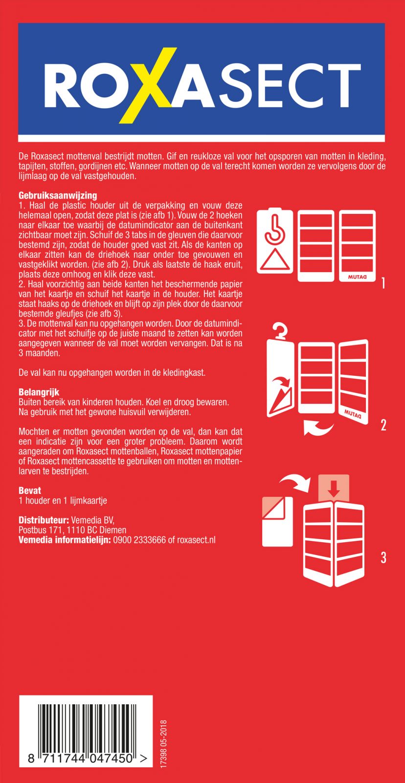 Haal de plastic houder uit de verpakking en vouw deze helemaal open, zodat deze plat is. Vouw de 2 hoeken naar elkaar toe waarbij de datumindicator aan de buitenkant zichtbaar moet zijn. Schuif de 3 tabs in de gleuven die daarvoor bestemd zijn, zodat de houder goed vast zit. Als de kanten op elkaar zitten kan de driehoek naar onder toe gevouwen en vastgeklikt worden. (zie afb 2). Druk als laatste de haak eruit, plaats deze omhoog en klik deze vast. Haal voorzichtig aan beide kanten het beschermende papier van het kaartje en schuif het kaartje in de houder. Het kaartje staat haaks op de driehoek en blijft op zijn plek door de daarvoor bestemde gleufjes (zie afb 3). De mottenval kan nu opgehangen worden. Door de datumindicator met het schuifje op de juiste maand te zetten kan worden aangegeven wanneer de val moet worden vervangen. Dat is na 3 maanden. De val kan nu opgehangen worden in de kledingkast.